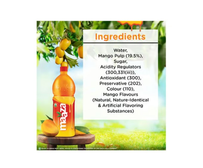 Water, Mango Pulp (19.5%), Sugar, Acidity Regulator (330), Antioxidant (300), Preservative (202), Colour (110), Contains Permitted Class II Preservative, Synthetic Food Colour & Added Flavours (Natural, Nature Identical, Artificial Flavouring Substances), Contains Fruit
